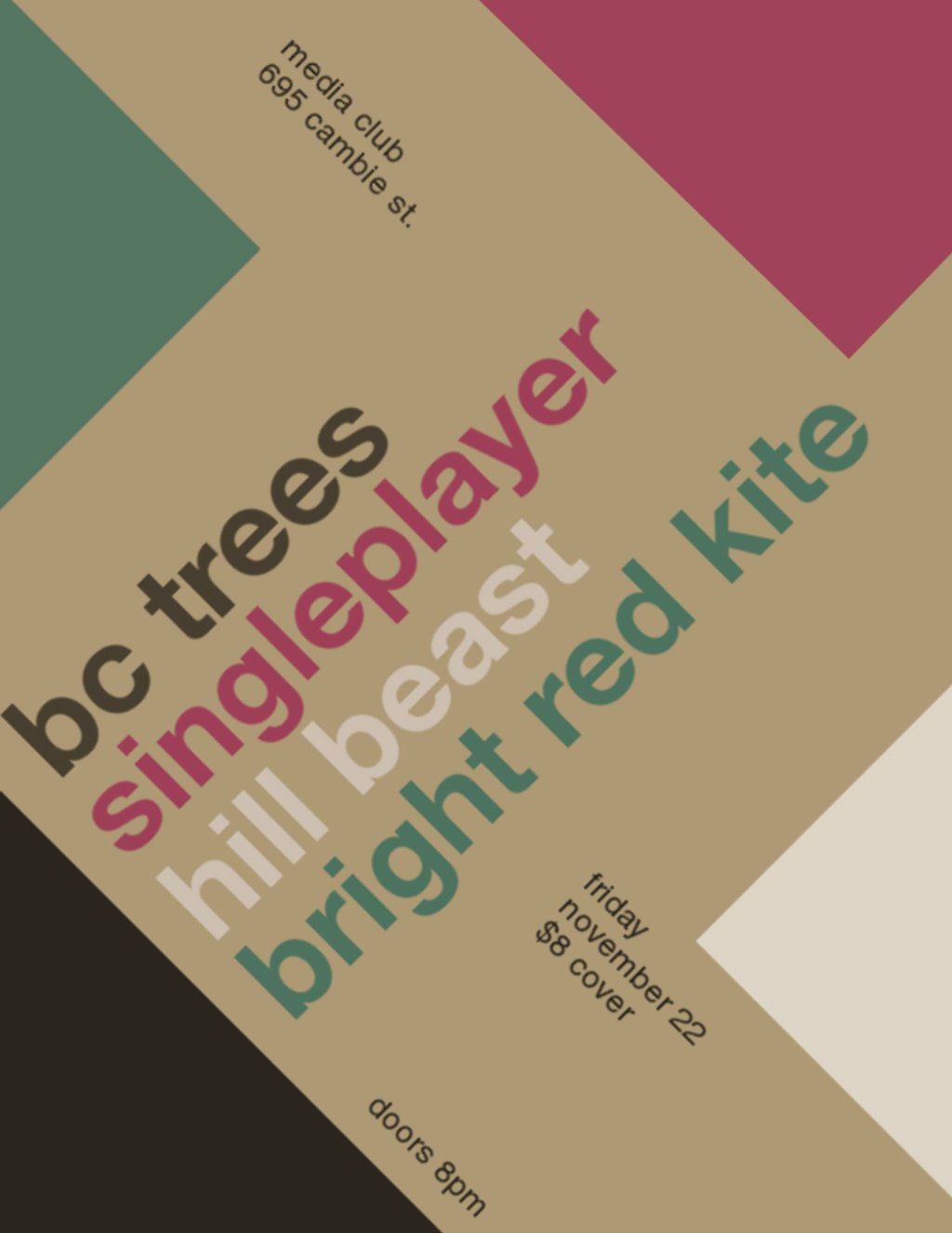 BC Trees, singleplayer, Hill Beast, Bright Red Kite @ The Media Club Nov 22 2013 - Feb 11th @ The Media Club