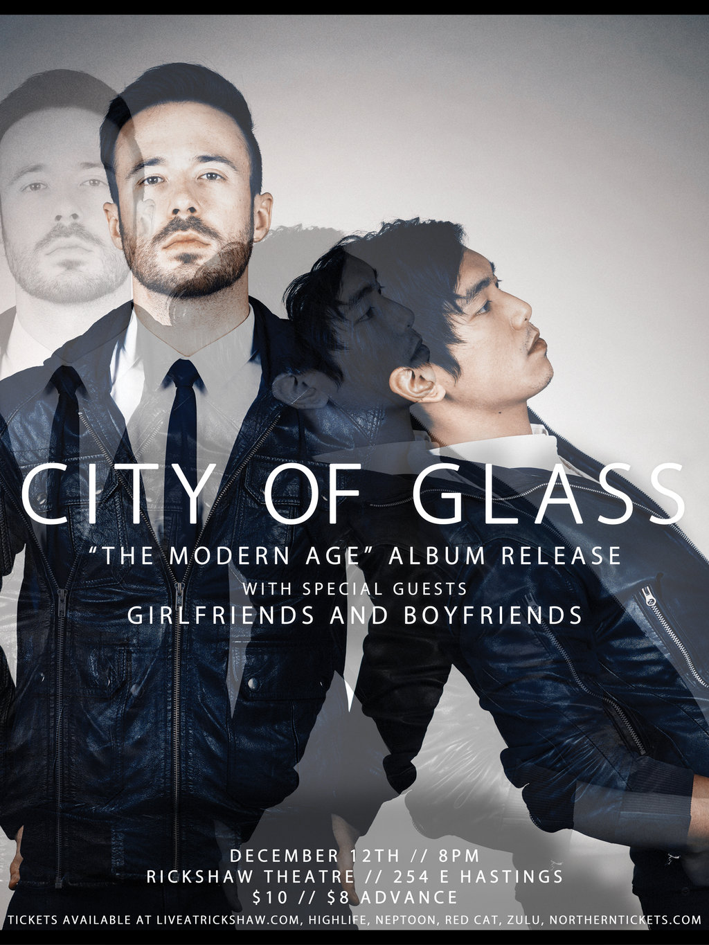 City of Glass is a Canadian duo comprised of Michael Champion and David Phu, two longtime friends and opposite personalities. The band was born in Vancouver and cut its teeth in Berlin and across Germany. Drawing from older dark pop favourites, (The Cure, New Order) modern inspirations, (Foals, The Whitest Boy Alive) and a love of electronic music, City of Glass have crafted a unique and memorable sound on their debut LP, "The Modern Age."