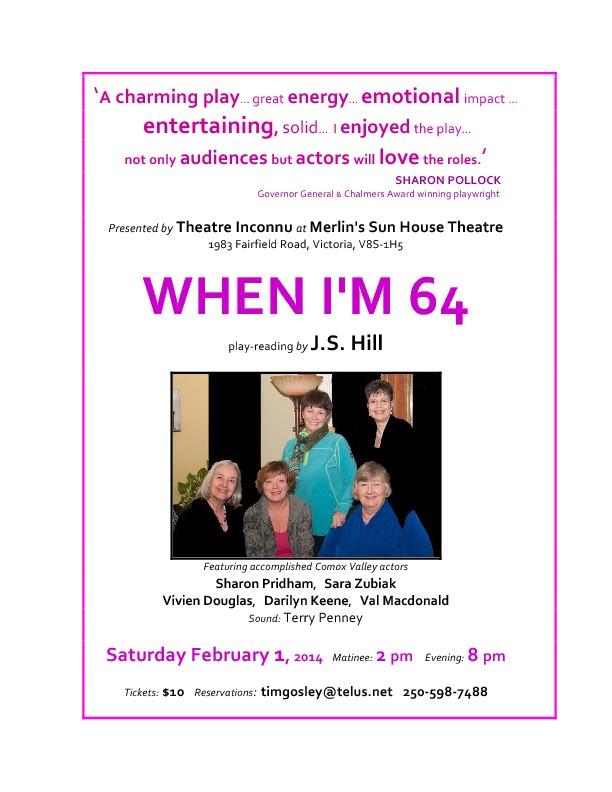 Staged play-reading of 85 minute charming new play by Vancouver Island playwright, J.S. Hill. about six older women in transition.