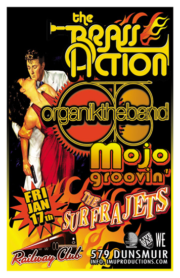 . Friday, January 17th IMU presents The BRASS ACTION, ORGANIK THE BAND, MOJO GROOVIN' & The SURFRAJETS @ The Railway Club, 579 Dunsmuir . Show 9:30pm sharp! Purchase advance tickets online @ http://www.imuproductions.com/tix