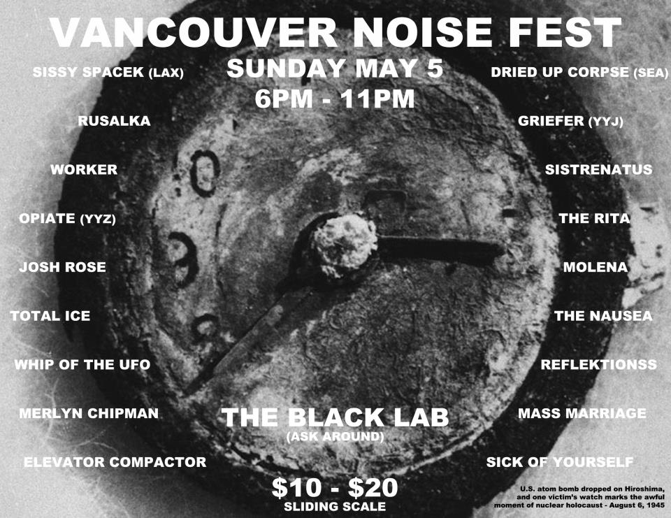 sissy spacek (LA 10:45PM), Josh Rose, griefer (Victoria), Rusalka, The Rita, WORKER, Sistrenatus, REFLEKTIONSS, OPIATE  (Toronto), Whip of the U.F.O., MOLENA, THE NAUSEA  , Elevator Compactor, Mass Marriage, TOTAL ICE, SICK OF YOUR SELF  (kamloops) @ The Black Lab (ask around) May 5 2013 - Feb 12th @ The Black Lab (ask around)