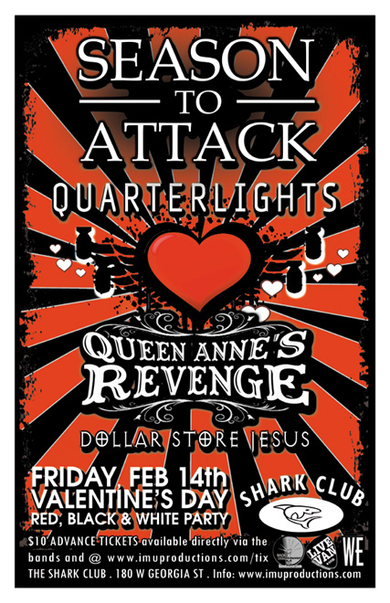 . Friday, February 14th IMU presents RED, BLACK & WHITE PARTY! SEASON TO ATTACK, QUARTERLIGHTS, QUEEN ANNE'S REVENGE & The DOLLAR STORE JESUS @ The Shark Club, 180 West Georgia Street . Doors 8pm . Purchase advance tickets directly via the bands & online @ http://www.imuproductions.com/tix