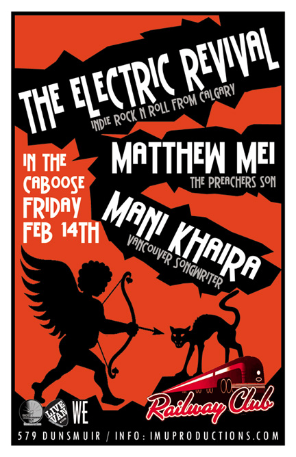 . Friday, February 14th - The ELECTRIC REVIVAL, MATTHEW MEI & MANI KHAIRA in the Railway's Caboose @ The Railway Club, 579 Dunsmuir . http://www.facebook.com/events/498512006931734