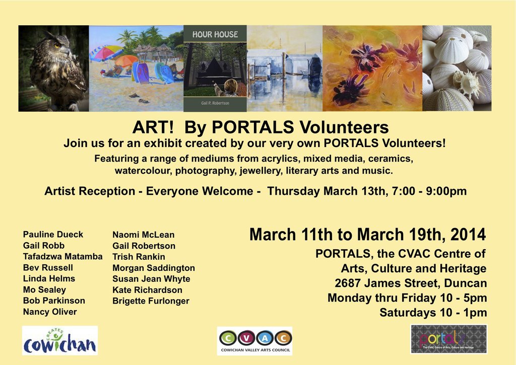 As a thank you to our hard working PORTALS Volunteers, they have the opportunity to show off their artwork in this fun show. Drop by and see what talents our volunteers have.