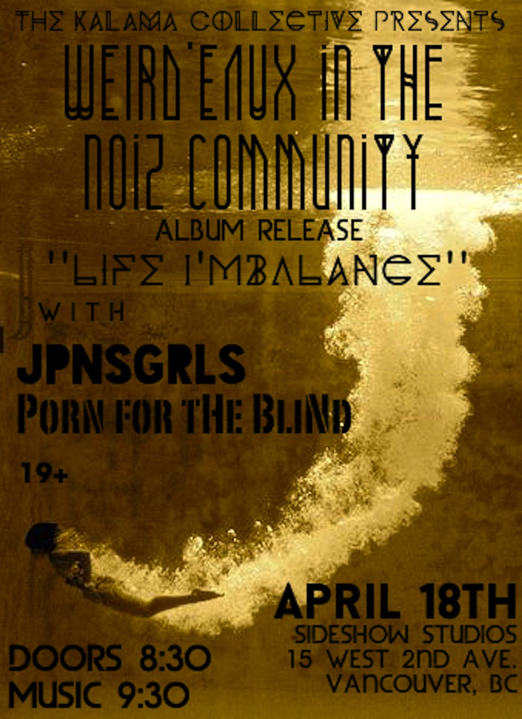 Weird'eaux in the noiZ Community, JPNSGRLS, Porn for the blind, DJ Matt In the Hatt @ Sideshow Studios Apr 18 2014 - Feb 19th @ Sideshow Studios