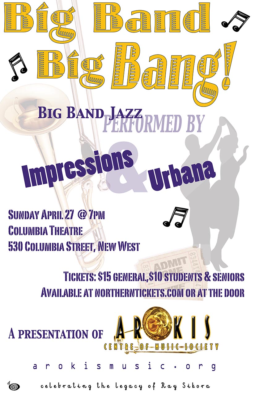A concert featuring two big bands – Impressions and Urbana, performing new material and old favorites from the big band jazz tradition. The event is also a fundraiser for the Arokis Center of Music Society, helping it preserve and promote big band music in Vancouver.