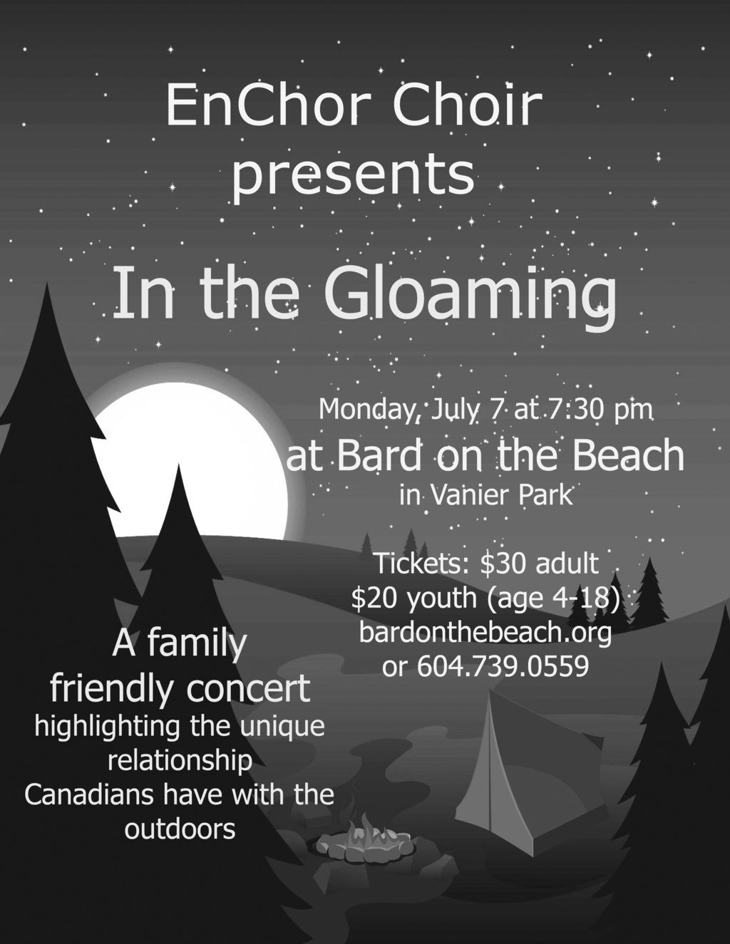 Relive wonderful memories of summer nights spent singing around a campfire. Join EnChor Choir for a family-friendly concert at the Bard tent, featuring music-from the classical to the ridiculous that highlights the unique relationship we have with the outdoors. “In the Gloaming”, where “Down by the Bay” sits alongside Gordon Lightfoot, and Stephen Foster snuggles up with Edward Elgar, will leave you with a smile and a full heart. Audience participation is encouraged. p.s. Bring the kids/grandkids!