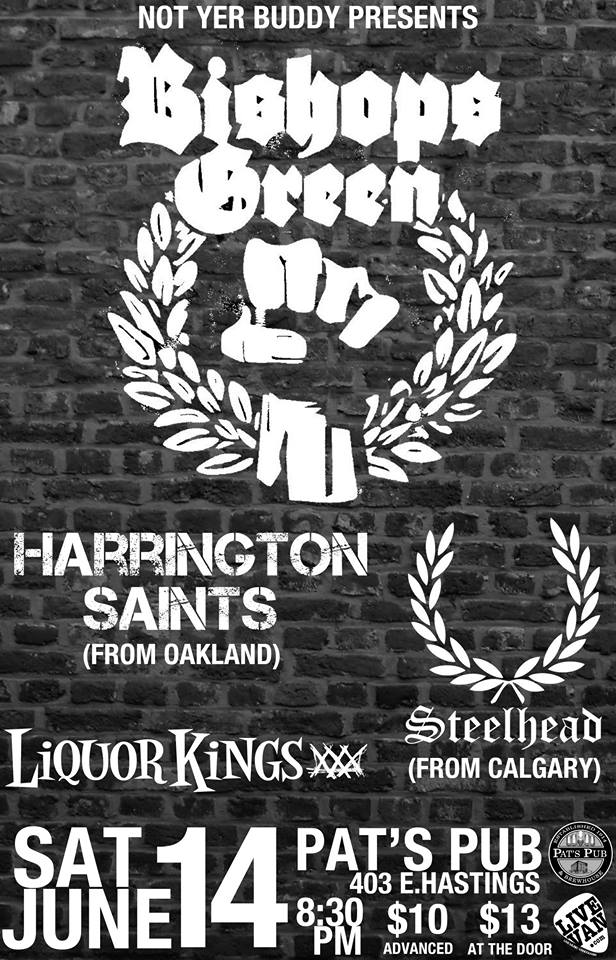 Harrington Saints those Oi Boys from the Bay Area are finally coming to Vancouver ... backed by pub rock royalty The Liquor Kings, Steelhead from Calgary (featuring members of Knifedogs) and up and coming catchy melodic oisters The Rosa Lee! mark your calendars, lace up yer boots ladies and lads because this is gonna be one for the books!!!