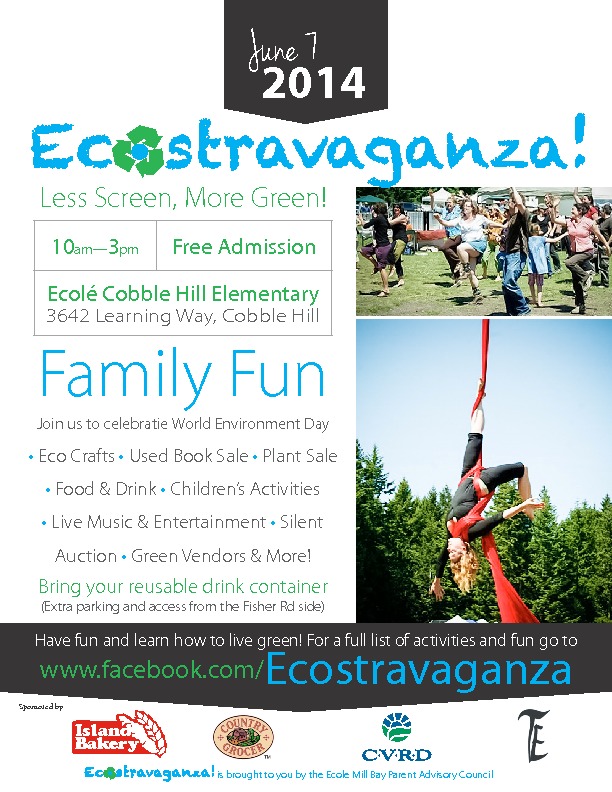 June 7, 2014 – Ecostravaganza! Come for a fun, family celebration from 10 am to 3 pm at Ecole Cobble Hill, 3642 Learning Way, Cobble Hill, includes kids’ green carnival activities, plant sale, eco-marketplace, used book sale, live stage, silent auction and much more. Learn about living green in the Cowichan Valley. Free admission.