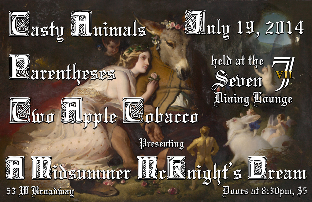 Shakespeare himself couldn't have pinched a greater loaf: a truly misguided interpretation of a theatre classic. Three eccentric bands perform twixt recitation and minstrelsy, and at midnight we all celebrate Chris McKnight's birthday.