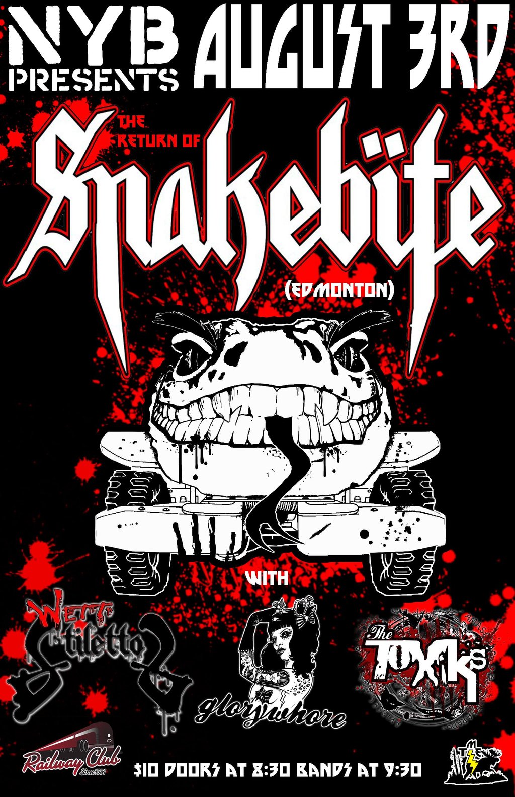 Our pals from Edmonton Snakebïte are coming for the show and staying for your women. Putting the sex and violence back in rock 'n roll where it's meant to be. Sailing the seas of sleaze with local sex magnets Wett Stilettos, joined this night by Glorywhore and The Toxiks ... quite possibly the greasiest sunday of yer life!