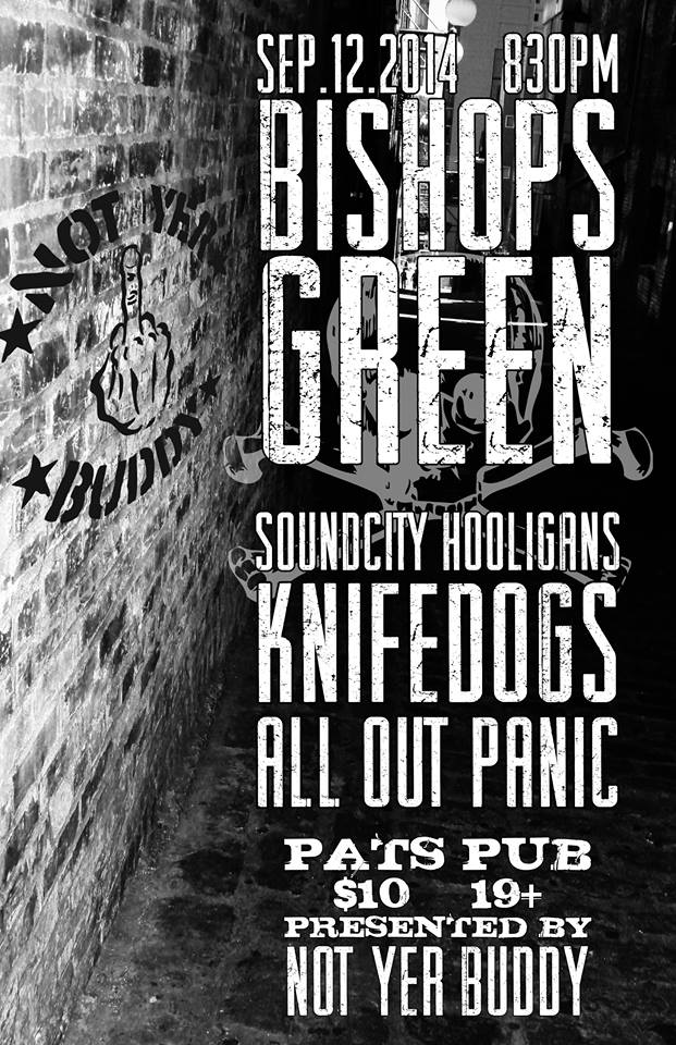 after another onslaught of European and American tour dates the Bishops Green boys are coming back home for a 'bro show' of mammoth proportions ... with Calgary's Knifedogs, SoundCity Hooligans from Kamloops and Vancouver's ALL OUT PANIC this bill is gonna hit ya harder than a steel toe boot to the head!