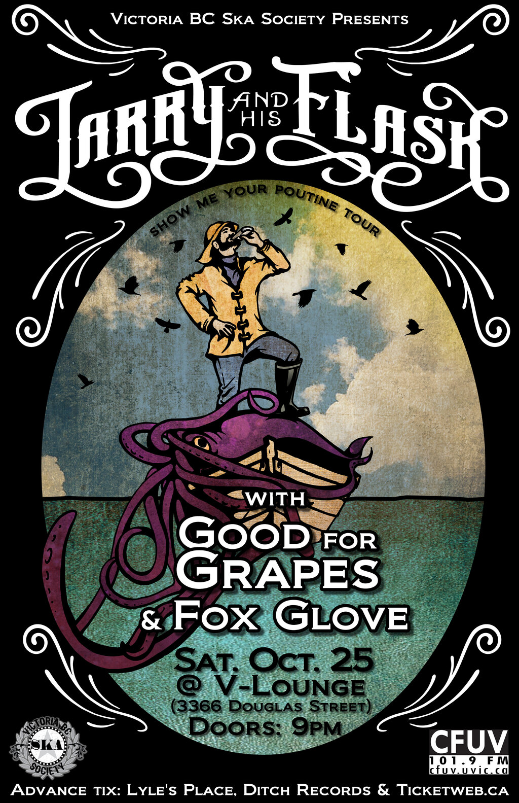 It is with great disappointment that we have to announce the cancellation of LARRY AND HIS FLASK, Good For Grapes & Fox Glove at V-Lounge next Sat. Oct 25, 2014 in Victoria BC. Refunds will be available at point of purchase. Ticketweb.ca customers will be refunded starting on Monday when staff are there to reverse payments.