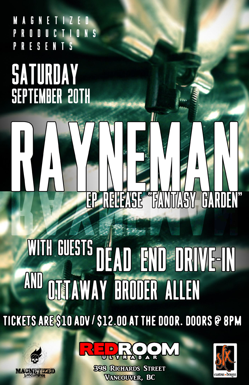 Saturday, September 20th .Rayneman EP Release - Self - Titled (Fantasy Garden) with Guests Dead End Drive-In and Ottaway Broder Allen at Red Room Ultra Bar, 398 Richards Street, Vancouver.. Tickets are $10 Adv / $12.00 at the door. Doors @ 8pm