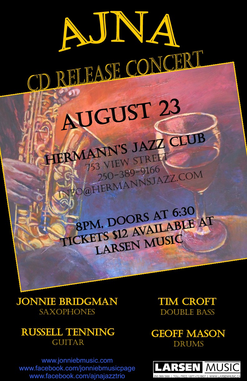 Fresh off their successful Okanagan tour, Victoria will finally get a chance to hear the new music Ajna cooked up this Spring. The concert will include a live performance of the original compositions from Ajna's new CD "The Day After" as well as music by Michael Brecker, George Benson, Sonny Rollins and others with a few guest appearances. Ajna delivers a no-limits performance encompassing elements of bop, funk, swing and latin music to create a fresh, unique and exciting jazz sound.