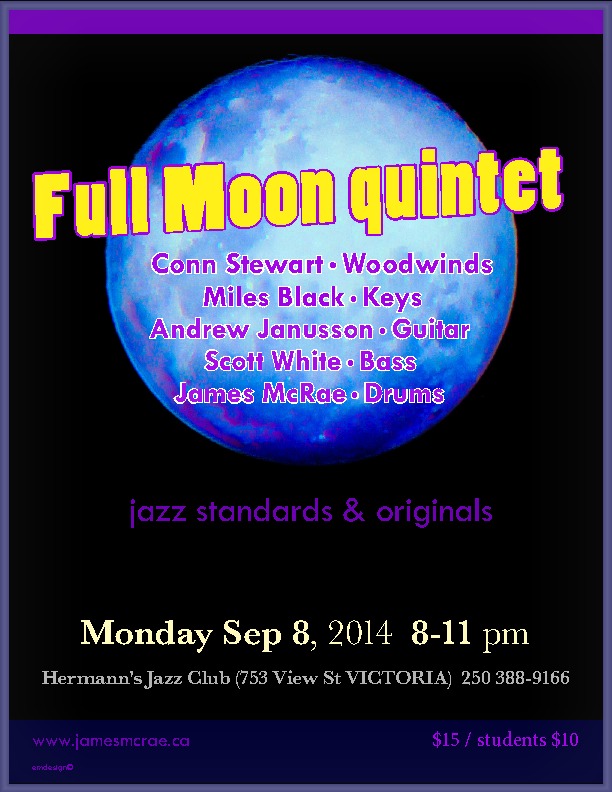 Full Moon Quintet: James MacRae, Scott White,  Andrew Janusson , Miles Black, Conn Stewart @ Hermann's Jazz Club Sep 8 2014 - Feb 12th @ Hermann's Jazz Club