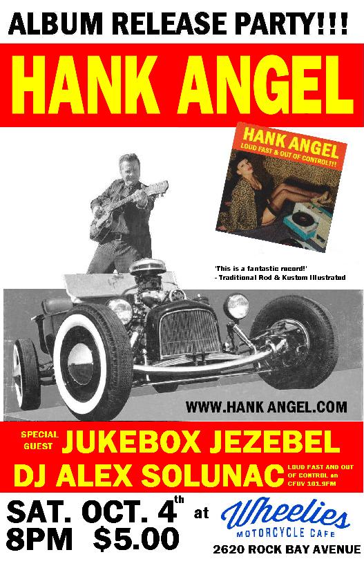 Hank Angel will be tearin' it up at Wheelies Motorcycles - the COOLEST spot in town - to celebrate the release of his new 17 song album! Special performance by Jukebox Jezebel with DJ Alex spinning the greasy tunes!