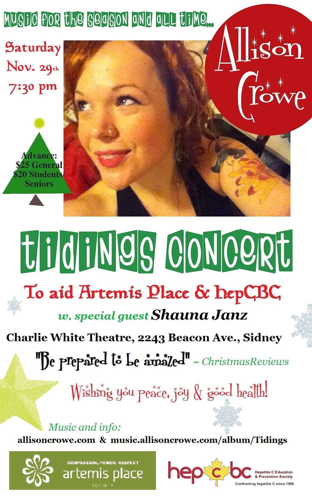 Join us for Tidings - a concert to warm a Winter’s night and aid two dedicated, hard-working, Victoria-based non-profits, Artemis Place, (girls’ educational and life skills), and HepCBC. Music for the season and all time!