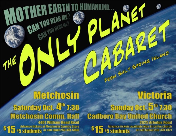 The Only Planet Cabaret is an exhilarating evening of theatre that addresses pressing environmental issues with wit, verve and style. It's coming to Victoria Sunday October 5. The performance will raise funds for First Nations legal challenges against Enbridge's proposed Northern Gateway pipeline and tankers. Five Salt Spring Island writers, performers, musicians and activists bring together passionate singing and songwriting, intimate story-telling, powerful performance poetry and exuberant musical theater, in a style all their own. The Cabaret has rewritten and repurposed show tunes, folk songs and rock 'n' roll to craft a show that gives voice to our unspoken fears and doubts, hopes and inner strengths in the face of an environment in crisis. Jeremy Loveday, two-time defending Victoria Poetry Slam Champion, is the opening act.