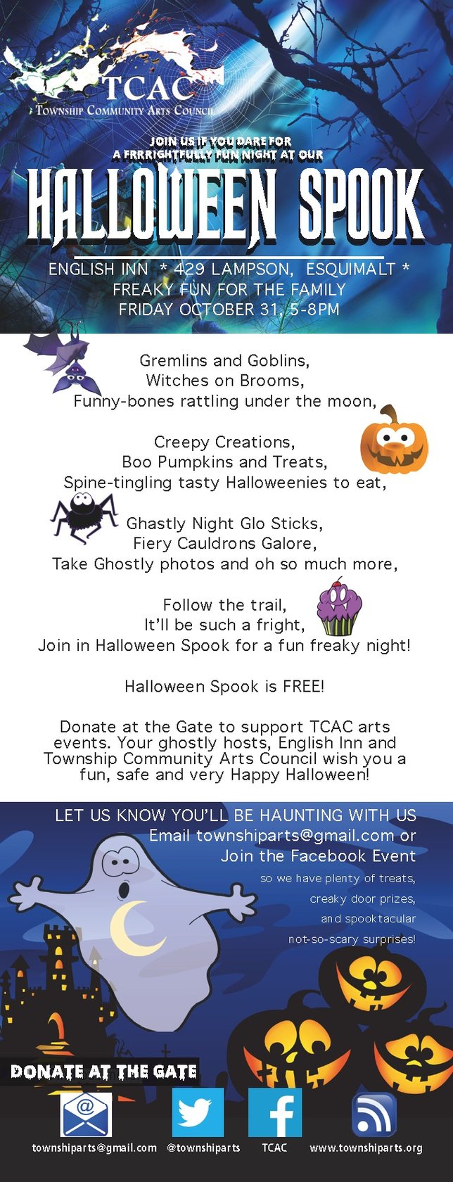 Join us if you dare and follow the ghostly trail to Halloween Spook at our very own Haunted Mansion at the English Inn 429 Lampson Rd Esquimalt, on Friday Oct 31st from 5-8pm...Free fun for the whole family...Free family photos, treasure maps, creaky door prizes, trick or treat and so much more in store...Halloweenies and Potions available for purchase at a screamingly low price