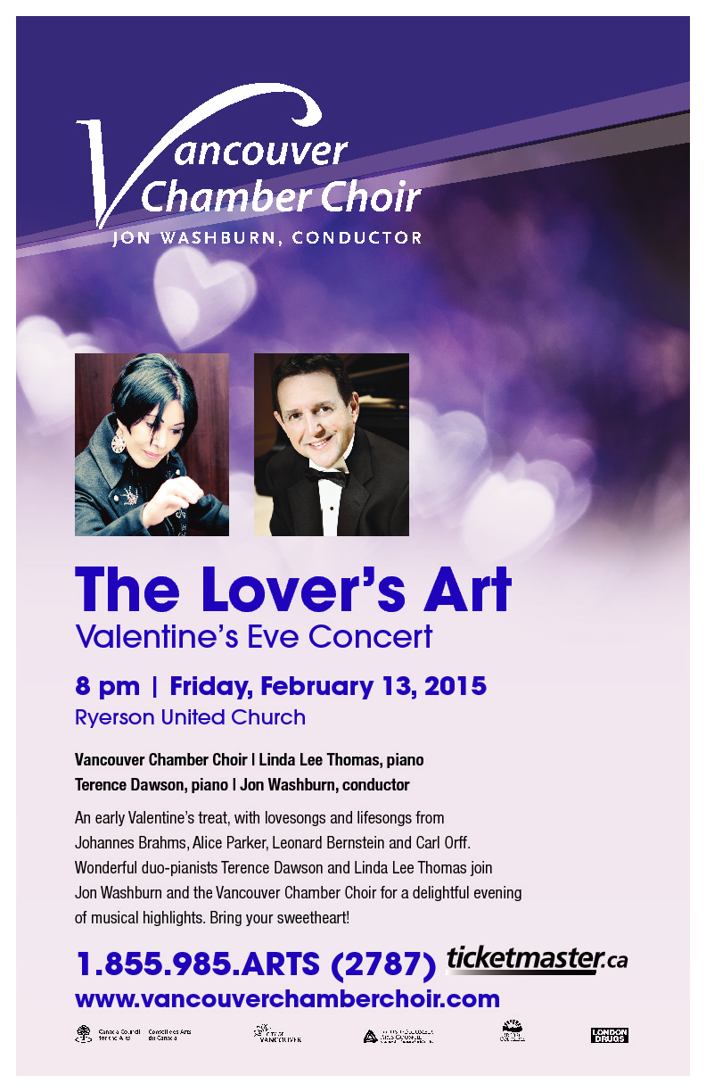 THE LOVERS' ART Valentine's Eve Concert: Vancouver Chamber Choir, Jon Washburn (conductor), Terence Dawson (piano), Linda Lee Thomas (piano) @ Ryerson United Church Feb 13 2015 - Feb 20th @ Ryerson United Church