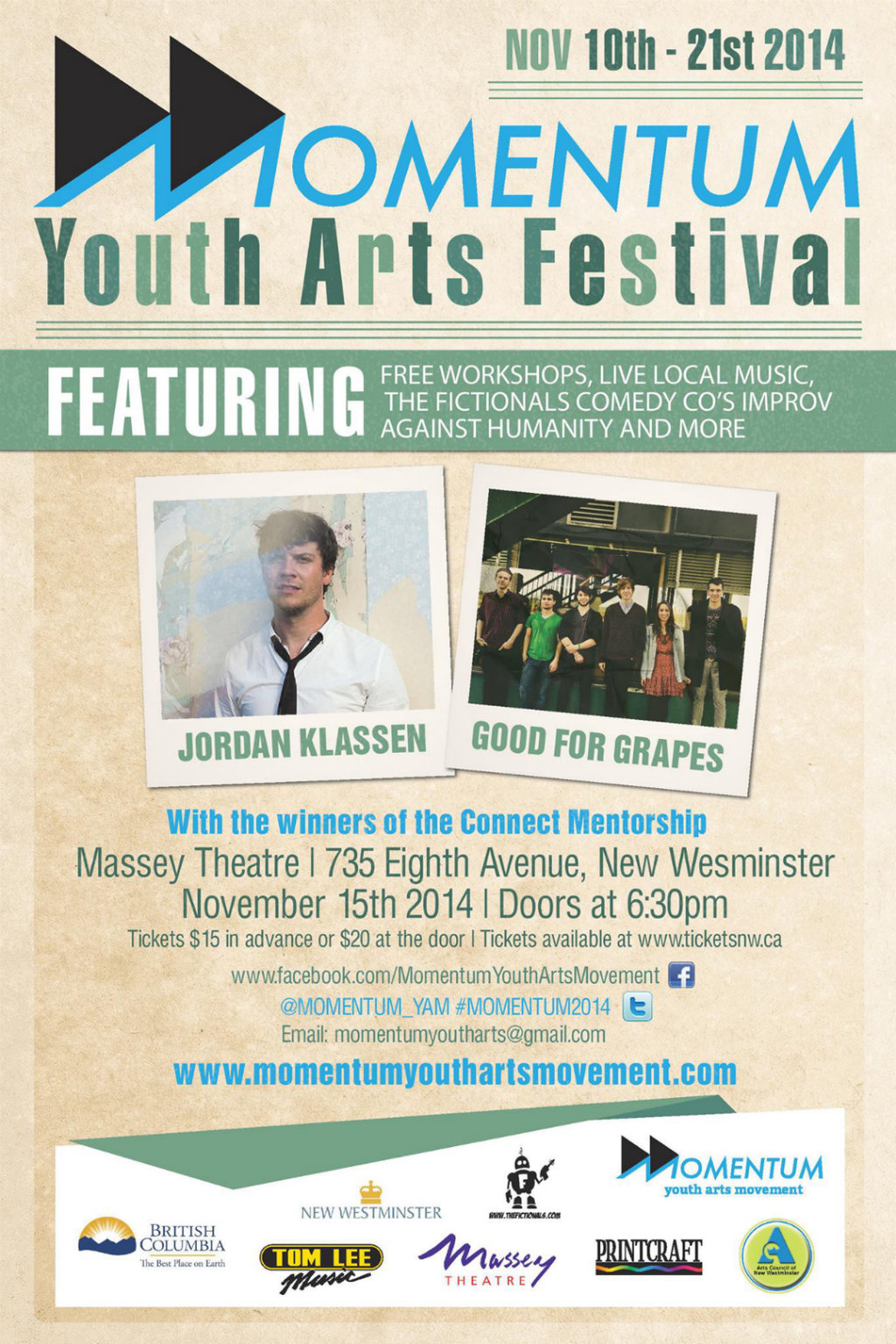 The Momentum Youth Arts Committee has another action packed instalment of the Momentum Youth Arts Festival. Popular local groups Jordan Klassen and Good For Grapes will be co-headlining this year’s festival on Saturday, November 15th, which will also be featuring opening performances by the selected youth musicians from the new CONNECT Mentorship program, Alluvium and This Side of Town.