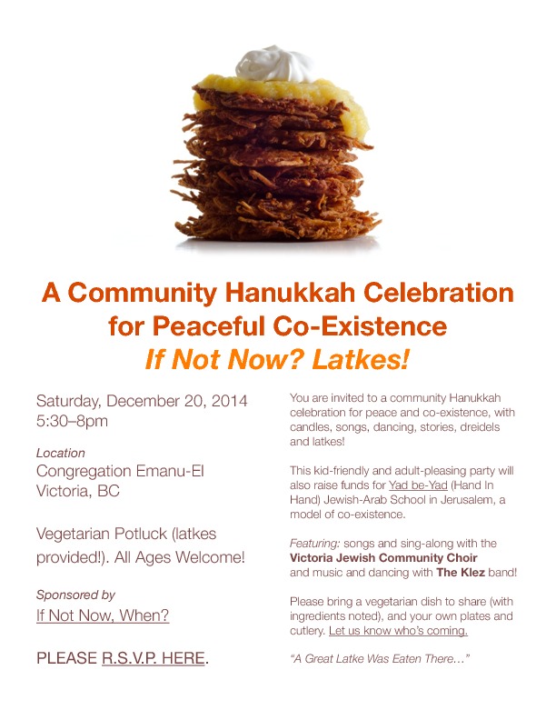 Come for some delicious latkes, music, dancing and warm company. And all for the good cause of peaceful co-existence.