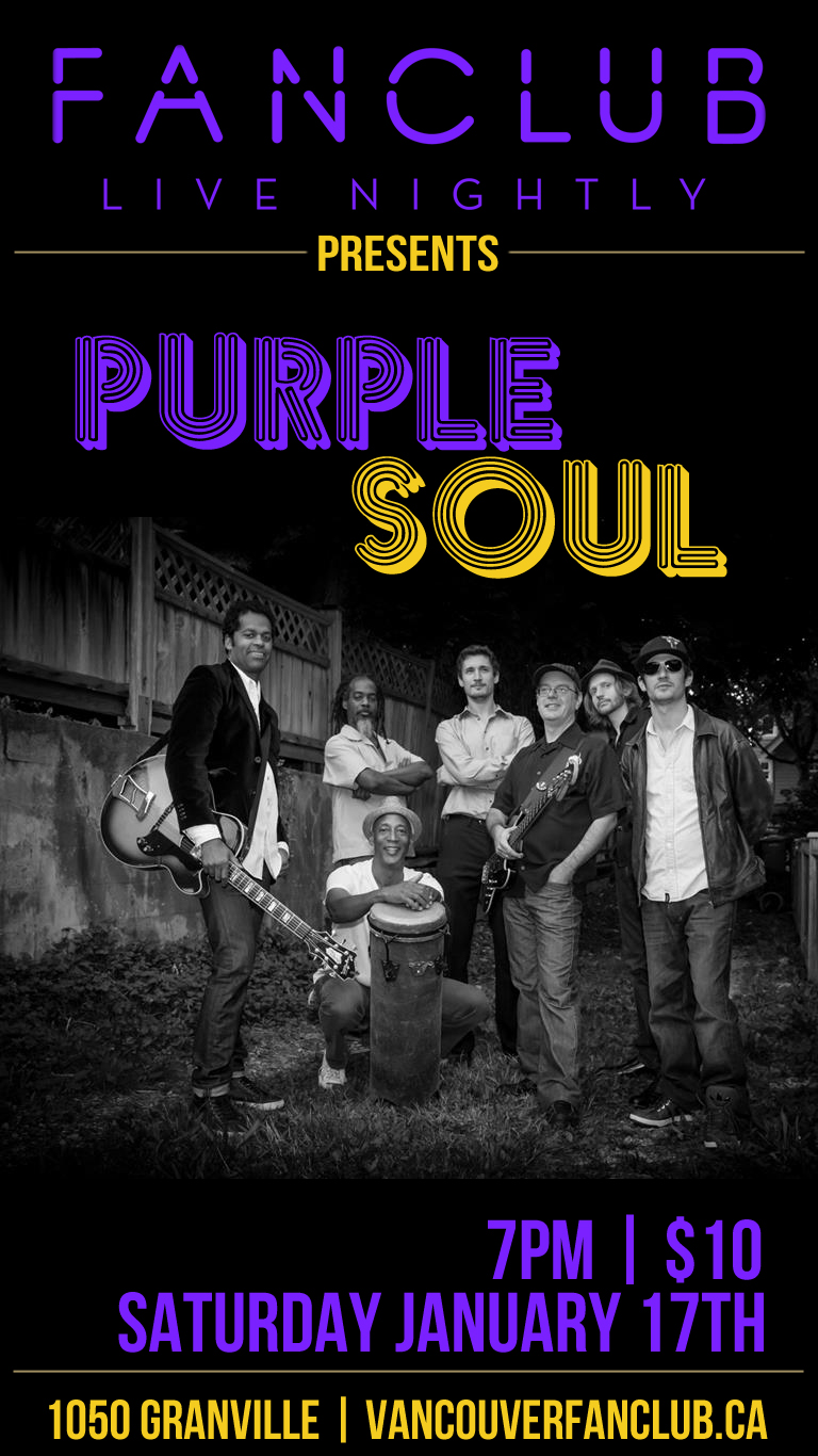 Purple Soul is a Vancouver reggae, rocksteady, dancehall and ska band. The group's seven veteran musicians draw on such influences as Bob Marley, Toots and the Maytals, Desmond Dekker, Gregory Isaacs, Barrington Levy and Dennis Brown. Groove is the goal. Guaranteed to warm up da soul. Check them out on Facebook - PurpleSoulMusic - and check them out around town.