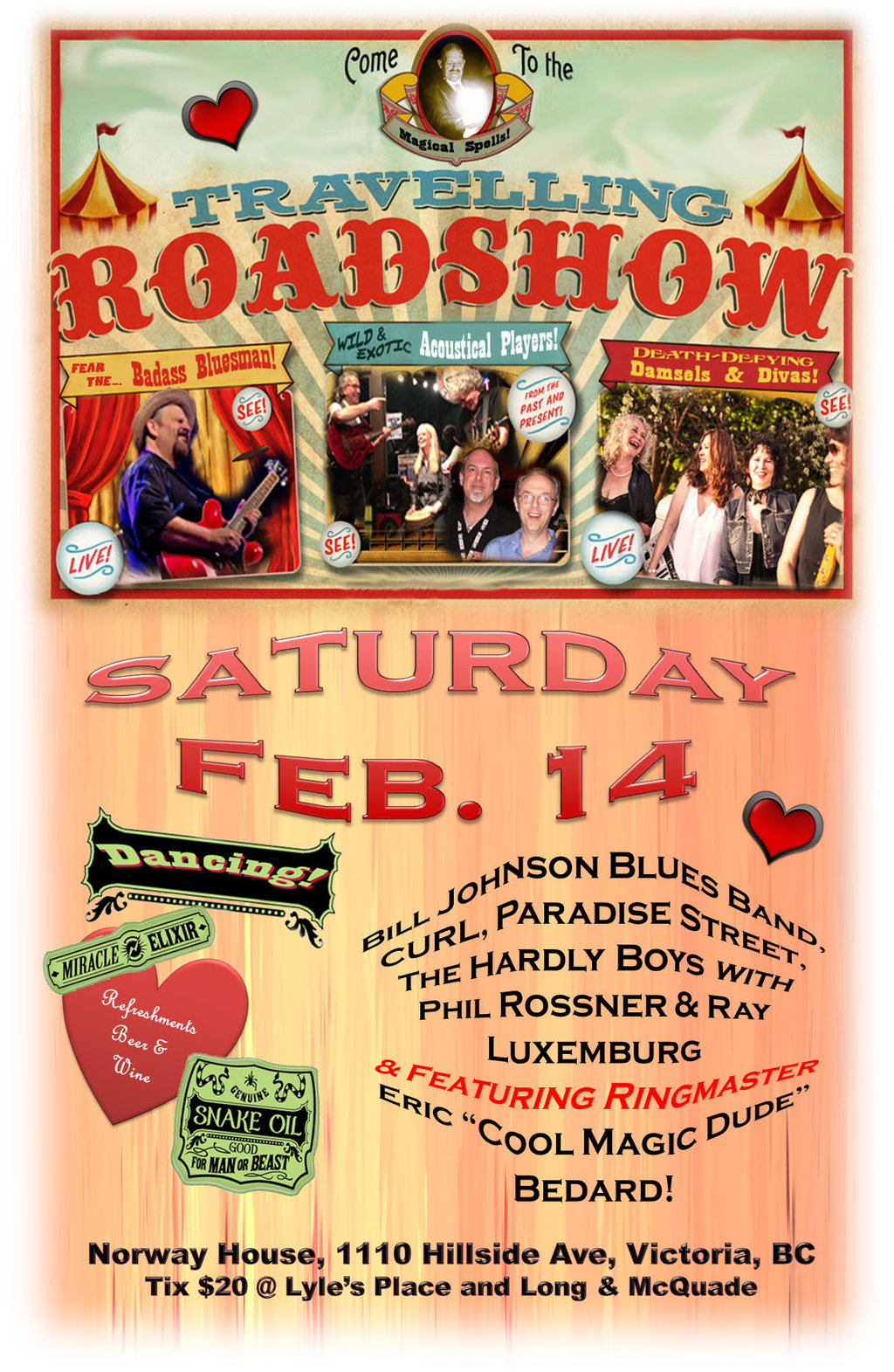 Enjoy roadshow-style entertainment unlike any other as a Valentine's gift to yourself and your sweetie. With Magician & Ringmaster "Cool Magic Dude" Eric Bedard as MC, bop to the acoustic guitar sounds of duo The Hardly Boys, featuring lively renditions of old Beatles classics & excellent guitar work. Next be dazzled by acoustic trio, Paradise Street, with roots revival songs and the gutsy rumble of stand-up bass. Fearless female foursome CURL follows, playing dance & blues tunes from legendary divas ranging from Aretha to Janis. Then boogie the rest of the night away to the the unparalleled blues magic of Victoria's favorite local bluesman, Bill Johnson. Finger foods provided. Beer and wine for sale.