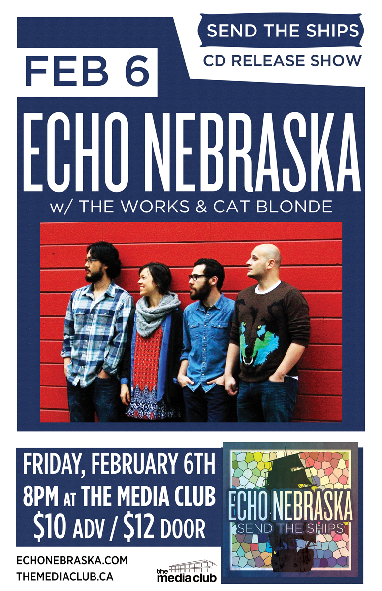 Come celebrate the release of Echo Nebraska's debut record, Send the Ships on Friday, February 6 at The Media Club. Joining the band are The Works & Cat Blonde.