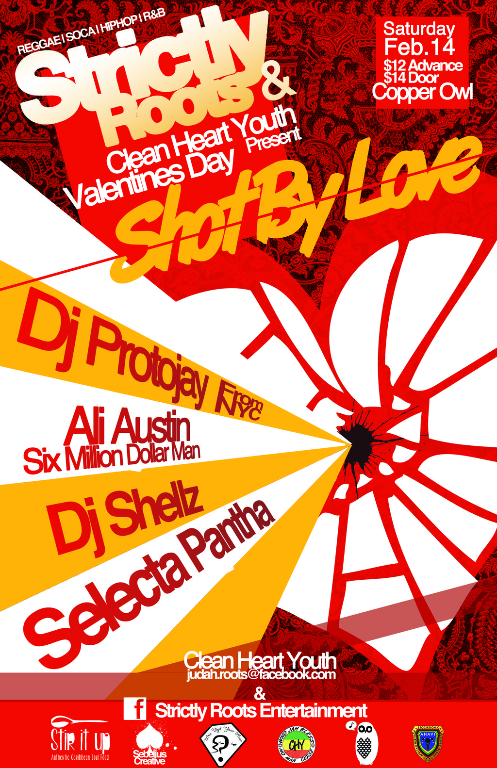 Strictly Roots & Clean Heart Youth present SHOT BY LOVE...SATURDAY FEBRUARY 14TH 2015. Special guest ... Dj Protojay from New York with Dj Shellz , Selecta Pantha and Ali Austin on the mic. $12 advance at Stir it Up Authentic Caribbean (778-432-0133 / 760A Yates st.) $14 @Copper Owl (1900 Douglas St.) Come as your favourite duo, i.e...bert & ernie; kimye; ackee & saltfish or combo i.e. salt, peppa & spinderella...whateva!