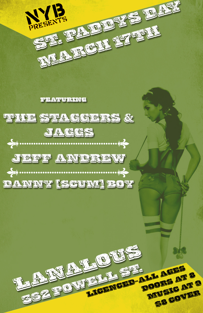 we're all gettin' a little green and dancin our arses off down at LanaLous with Danny (Scum) Boy kicking off the festivities with a set of classic irish drinking, fighting and loving songs , Jeff Andrew following with his raunchy fiddle folk swagger, then The Staggers & Jaggs to take us home with their unique blend of gypsy swing, bluesy, clusterfolk greatness ... this will be the cat's ass