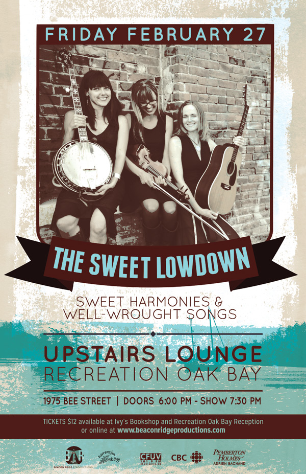These are well evident on The Sweet Lowdown’s latest award-winning album, “May,” produced by Adrian Dolan (The Bills, Ruth Moody), mastered by Joby Baker (Cowboy Junkies, The Bills) and released in November 2012. The album features ten original compositions and two traditional songs that demonstrate a wide range of influences, including Irish and Indian music. It earned the trio a nomination for a 2013 Canadian Folk Music Award, and follows on the heels of the band’s highly praised self-titled 2011 album, which received a nomination for “Album of the Year” by the Vancouver Island Music Awards.