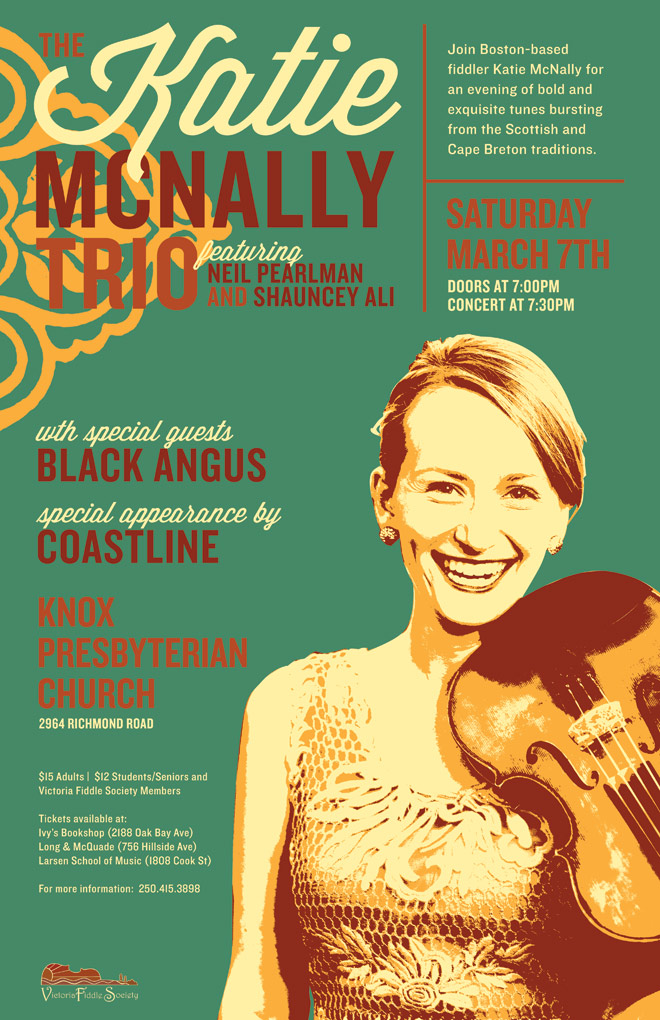 Katie McNally is described as “the new face of Scottish fiddling.” Katie, together with two of the most innovative voices in acoustic music in North America, genre-bending pianist Neil Pearlman and violist Shauncey Ali; are performing an evening of tunes bursting from the Scottish and Cape Breton traditions at Knox Presbyterian Church (2964 Richmond Road, Victoria) on Saturday, March 7th. Doors open at 7:00 pm.; with guest artist, Black Angus beginning at 7:30 pm.