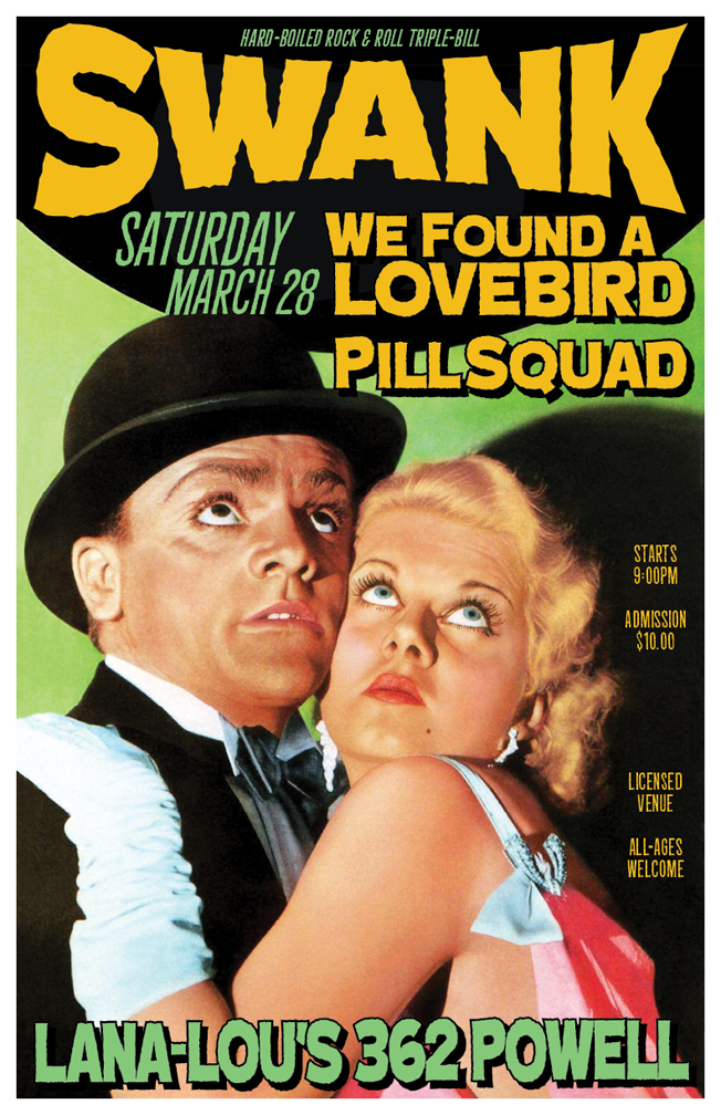 Those deadly dapper dons of big-city hillbilly chrome twang-a-rama SWANK return to Lana-Lou's with friends We Found A Lovebird, and Pill Squad!! Eclecticism works -- see & hear it in action Saturday March 28 at Lana-Lou's Rock & Roll Eatery (licensed; all ages welcome)