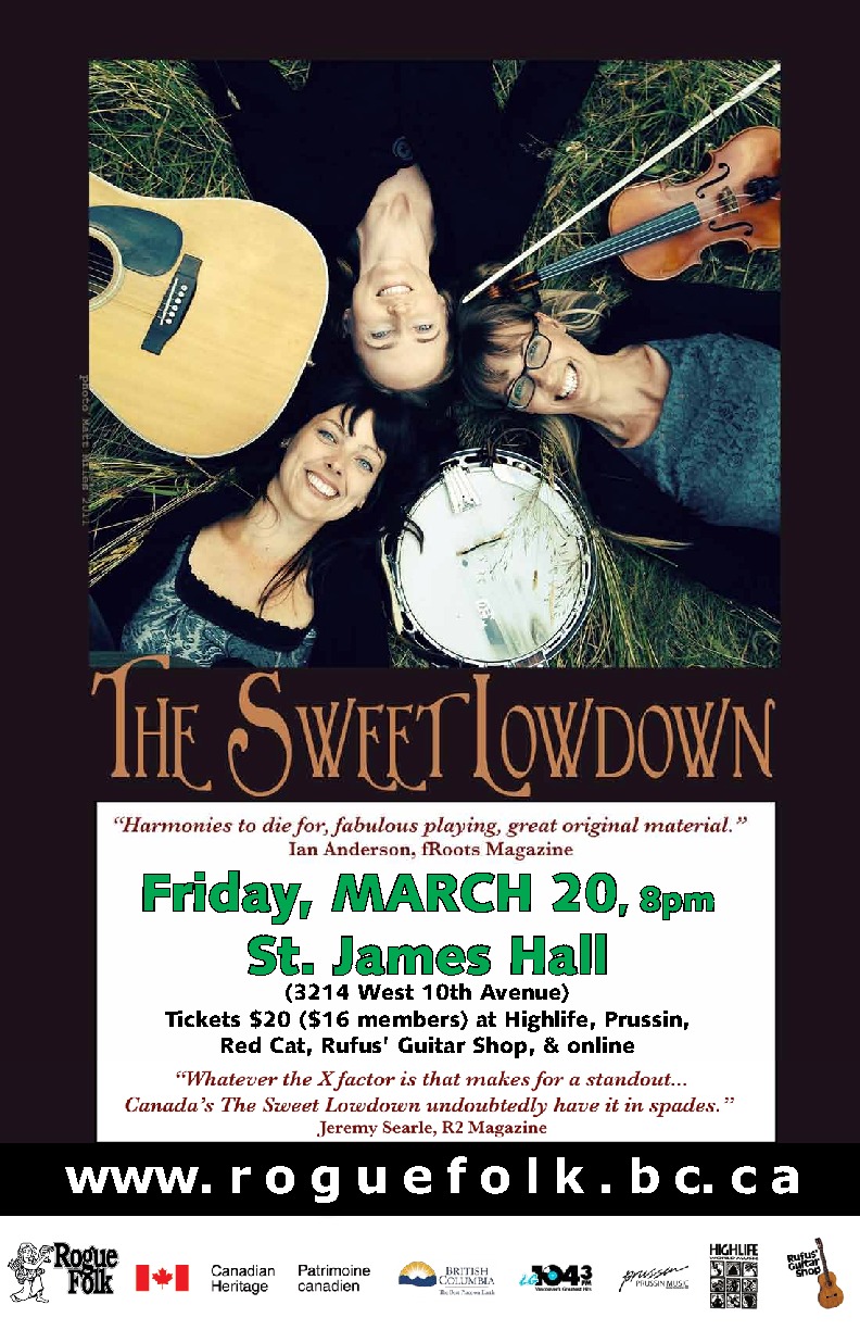 THE SWEET LOWDOWN can take you anywhere you want to go, from a sunny front porch to the outer reaches of the universe. Blending original songwriting and three-part harmonies with an old-time instrumental groove, this award-winning acoustic roots trio from Victoria, B.C. creates a unique yet timeless sound that takes listeners on a pleasurable and memorable journey.