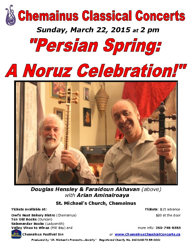 "Persian Spring; A Noruz Celebration!": Douglas Hensley, Faraidoun Akhavan, Arian Aminalroaya @ St. Michael and All Angels Church Mar 22 2015 - Jan 11th @ St. Michael and All Angels Church