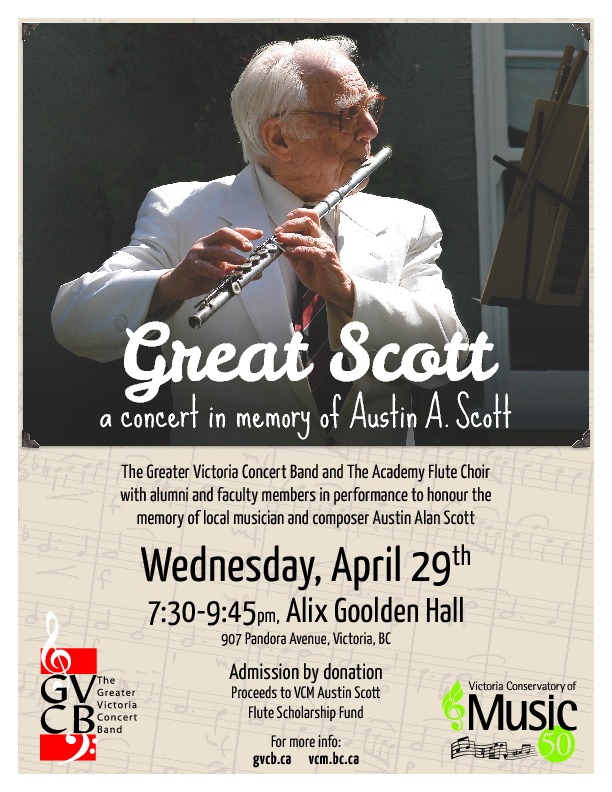 The Greater Victoria Concert Band and The Academy Flute Choir with alumni and faculty members in performance to honour the memory of local musician and composer Austin Alan Scott. Admission by donation: proceeds to VCM Austin Scott Flute Scholarship Fund.