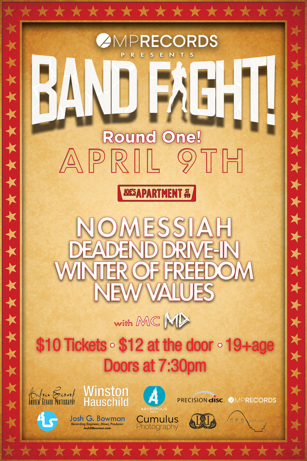 Band Fight will feature 16 local bands duking it out for a grand prize of a songwriting session with a professional songwriter, one professionally recorded song with Winston Hauschild, Mastering by CPS mastering, a photo shoot with Andrew Gerard Photography, artwork design Artropolis Media, 1,000 CD’s from Precision disc, and Radio Promotion and Publicity Campaign from AMP Records. Totaling over $20,000 worth of prizes for the winner… Not to mention bragging rights of being crowned as Band Fights “KING OF THE RING”.