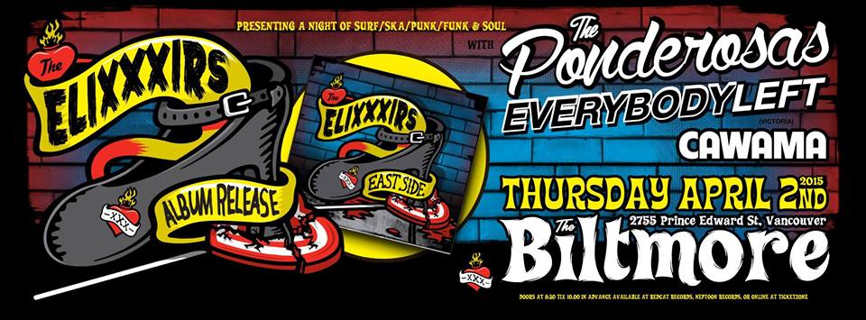THE ELIXXXERS present a night of Surf, Ska-Punk and Soul as they release “East Side” Thursday April 2nd at The Biltmore Cabaret (2755 Prince Edward St) in Vancouver BC. Doors 8:30pm, Music 9pm; Cover $15/$10 Advance; With guests The Ponderosas, Everybody Left , and Cawama.