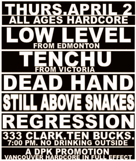 Low Level from Edmonton are hittin Vancouver this Spring with some fresh pit jams. Tenchu is bringing some wild grind from the island, and locals Dead Hand, Still Above Snakes, and Regression will be kickin us off in style.