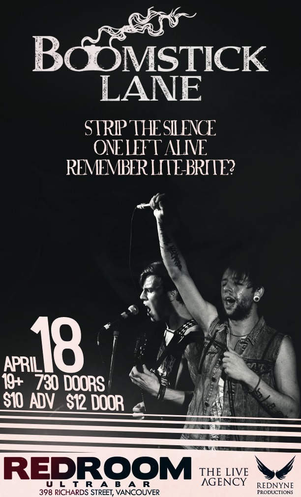 Rednyne Productions and The Live Agency are proud to present Boomstick Lane with special guests Strip The Silence, One Left Alive & Rednyne recording artists Remember Lite-Brite?, April 18th at The Redroom.