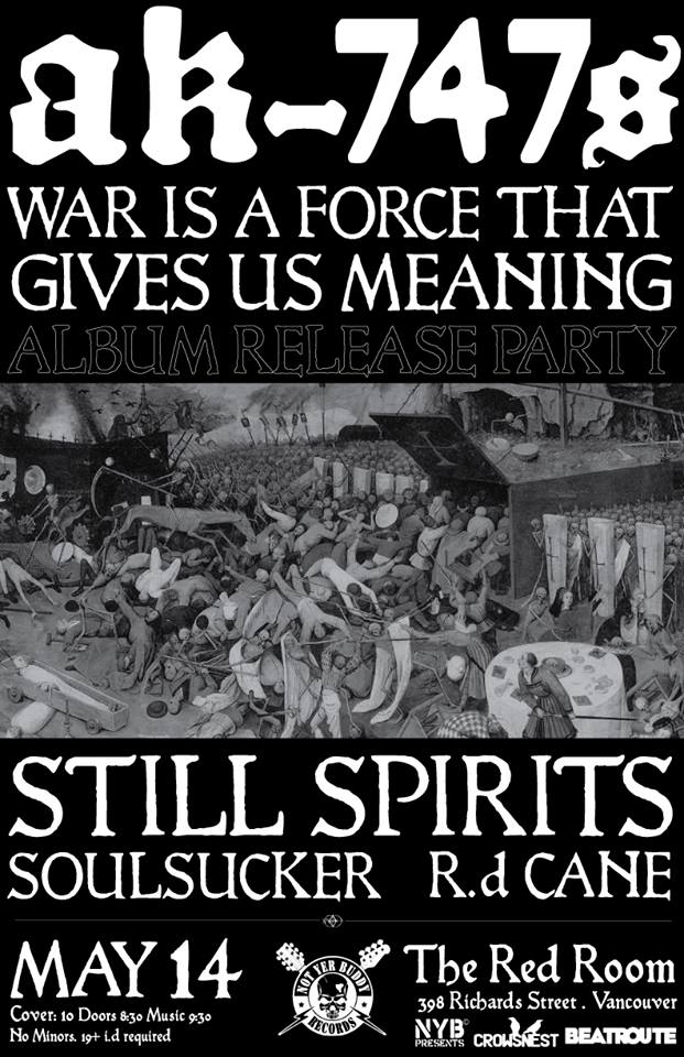 War Is a Force That Gives Us Meaning is the second full length album by Vancouver's AK-747s, releasing on NYB Records May 14th at the Red Room. Described by Beatroute as “making music under a kind of punk rock sobriquet rouge, insisted upon with pseudo-serious urgency”, and Co-Op Radio 102.7FM that “With so many bands in Vancouver being full of hipsters and synth, I think it’s great AK-747s are challenging Vancouver in the way they are, and I hope they keep doing it.”