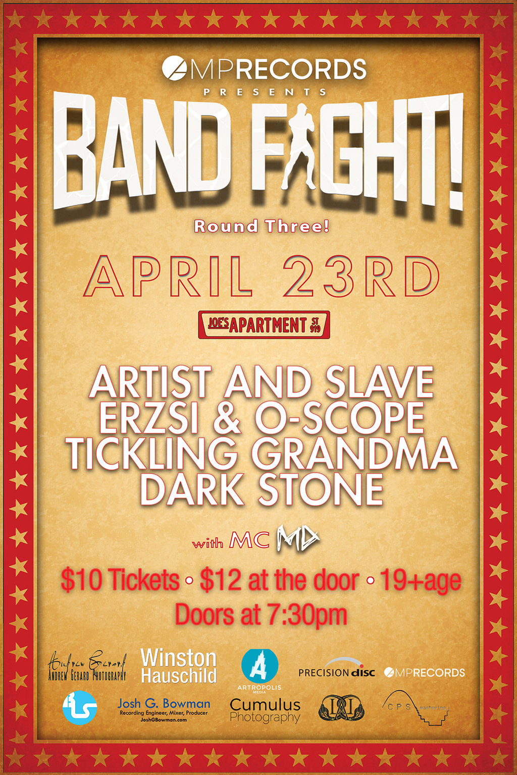 Band Fight will feature 16 local bands duking it out for a grand prize of a songwriting session with a professional songwriter, one professionally recorded song with Winston Hauschild, Mastering by CPS mastering a photo shoot with Andrew Gerard Photography, artwork design from Artropolis Media, 1,000 CDs from Precision Disc, and Radio Promotion and a Publicity Campaign from AMP Records. Totaling over $20,000 worth of prizes for the winner… Not to mention bragging rights of being crowned as Band Fights “KING OF THE RING”.