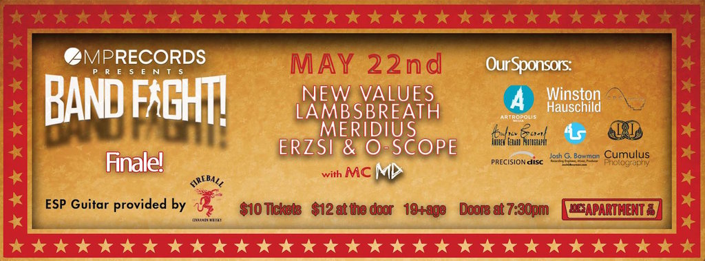 Band Fight: Finale: New Values , MERIDIUS, LAMBSBREATH, Erzsi & O-Scope @ Joe's Apartment May 22 2015 - Feb 10th @ Joe's Apartment