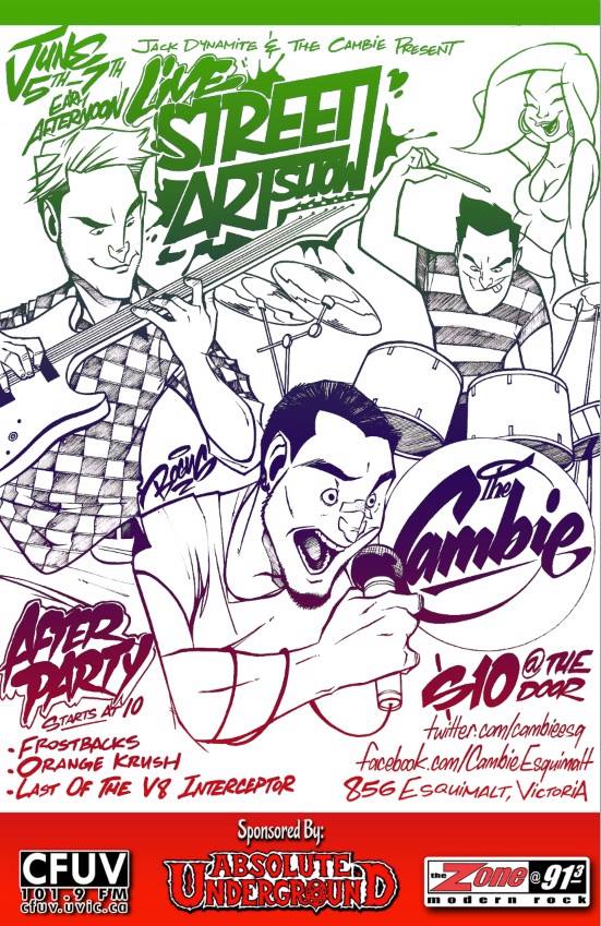 Live street art show with after party: Bogus and his friends, street art show, The Frostbacks, Orange Krush, Last V8 and The Interceptors @ The Cambie at the  Esquimalt Inn Jun 5 2015 - Dec 31st @ The Cambie at the  Esquimalt Inn