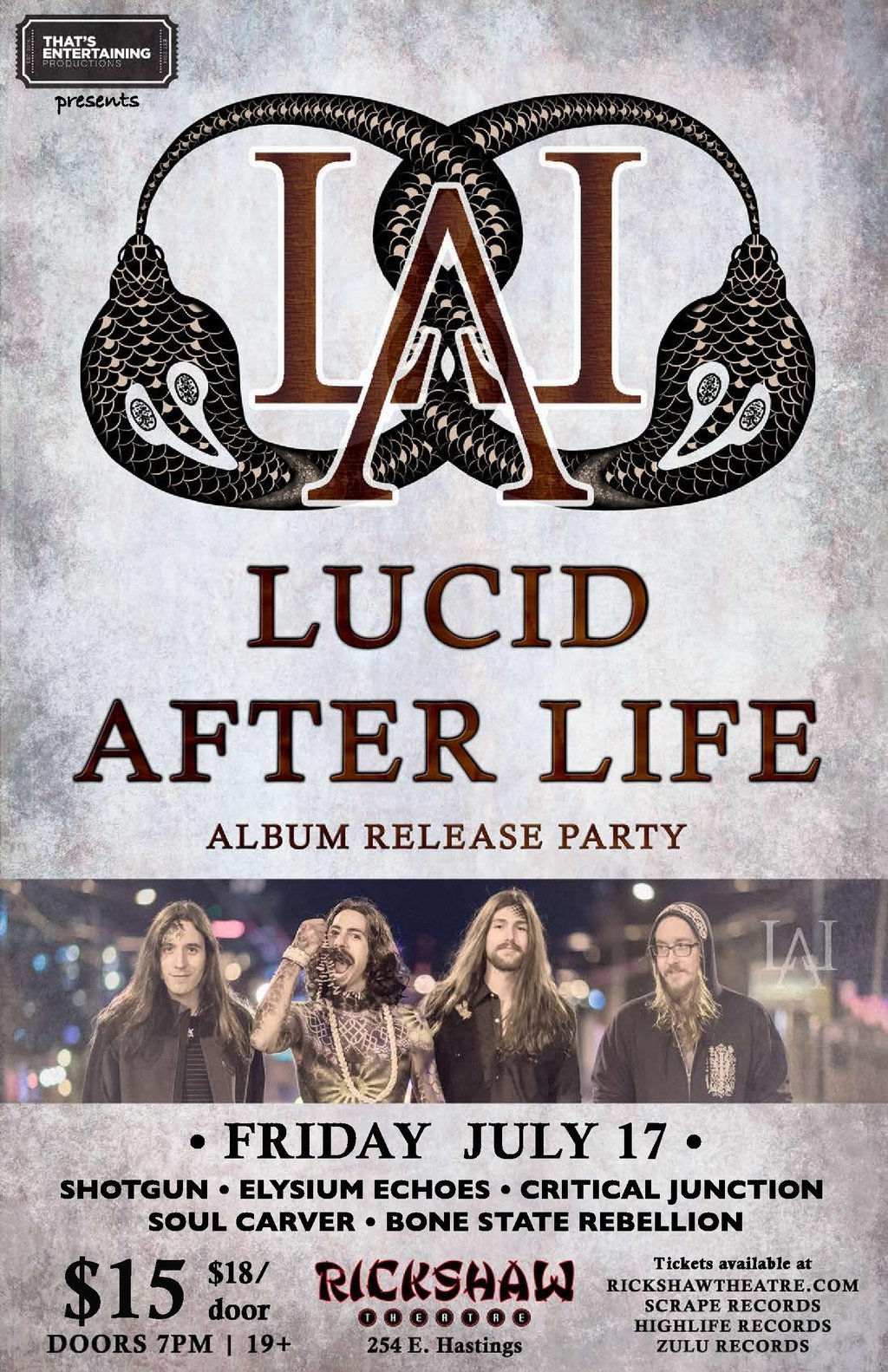 Vancouver, BC July 17 2015 – Indescribable Rock four piece Lucid After Life return to The Rickshaw Theatre on 454 E Hastings St, tickets are $15 and available at Scrape, High Life, Zulu and online at rickshawtheatre.com