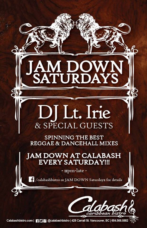 JAM DOWN Saturdays: DJ Lt. Irie, with special guests @ Calabash Bistro Jul 4 2015 - Feb 10th @ Calabash Bistro