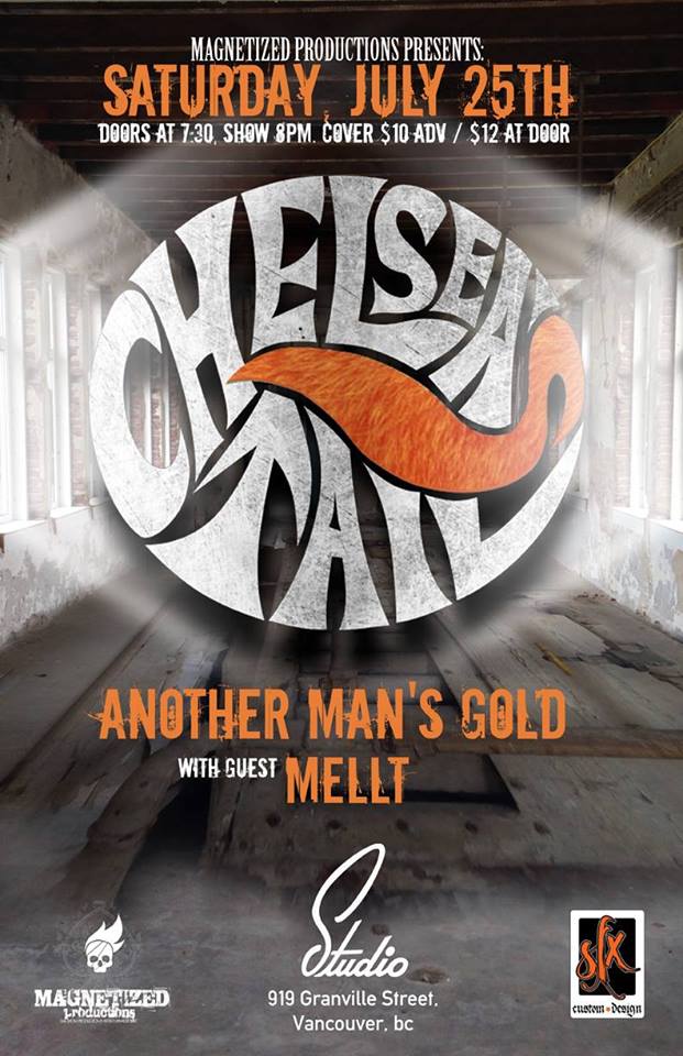 Magnetized Productions presents: Chelsea's Tail / Another Man's Gold with Guest.Mellt. Saturday,July 25th at Studio, (919 Granville Street, Vancouver, BC). Doors at 7:30, Show 8pm. Cover $10 Adv / $12 at Door.