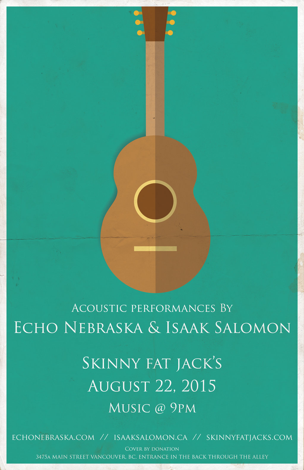 Join Vancouver folk-rockers, Echo Nebraska and Isaak Salomon for a pair of acoustic performances on Saturday, August 22nd at Skinny Fat Jack's. The acts are inviting everyone to join them for dinner at 8pm, before the music starts at 9pm. Cover is by donation.